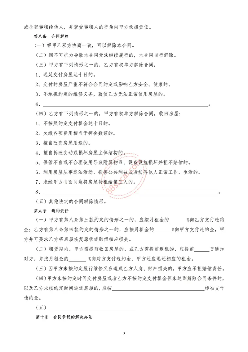 (一)甲方有第八条第三款约定的情形之一的,应按月租金的 %向乙方支付违约金;乙方有第八条第四款约定的情形之一的,应按月租金的 %向甲方支付违约金,甲方并可要求乙方将房屋恢复原状或赔偿相应损失。