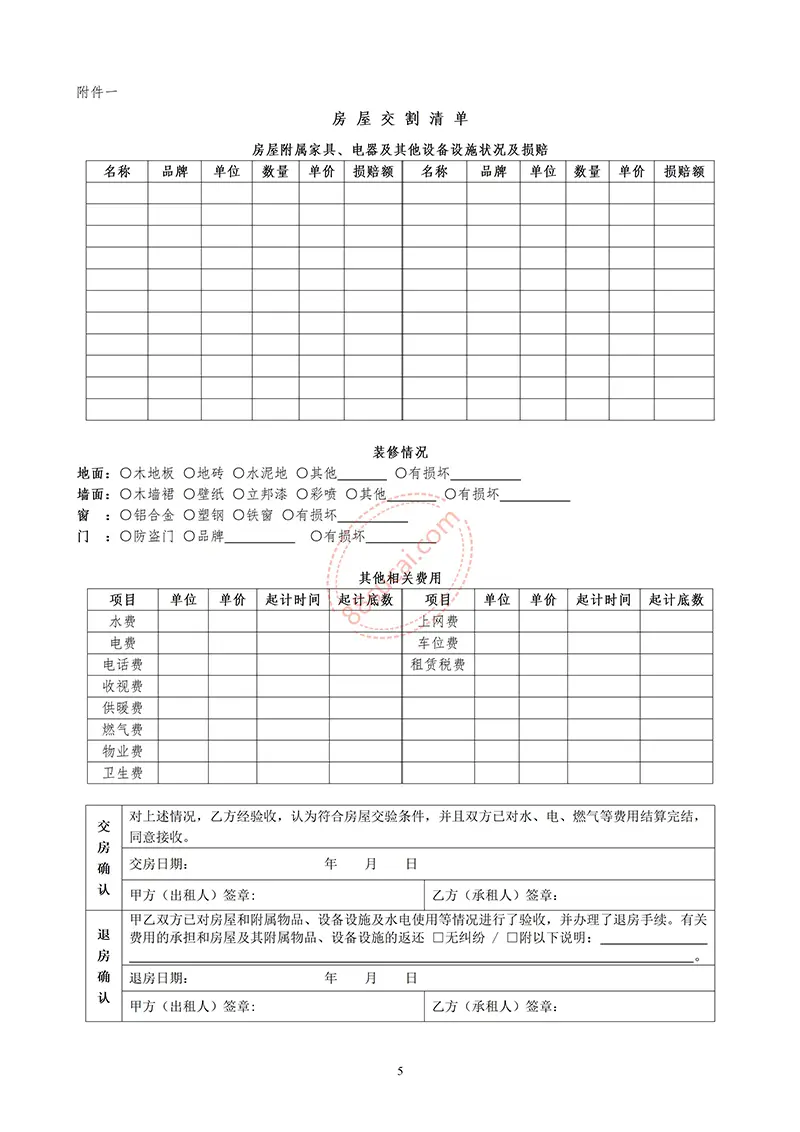| 退房确认 | 甲乙双方已对房屋和附属物品、设备设施及水电使用等情况进行了验收,并办理了退房手续。有关费用的承担和房屋及其附属物品、设备设施的返还 □无纠纷 / □附以下说明: