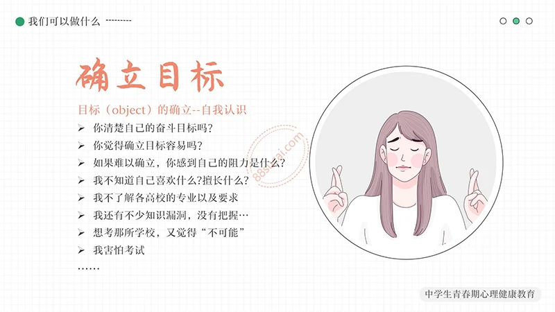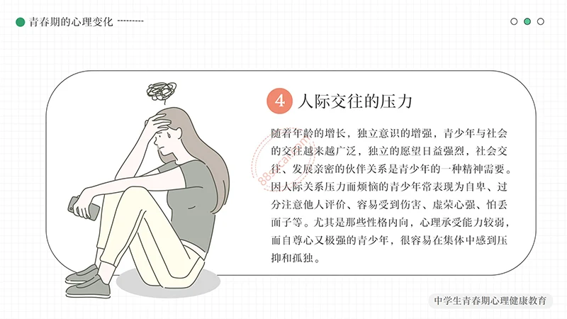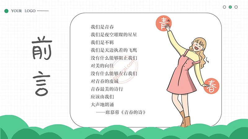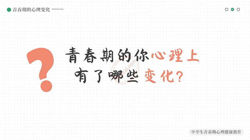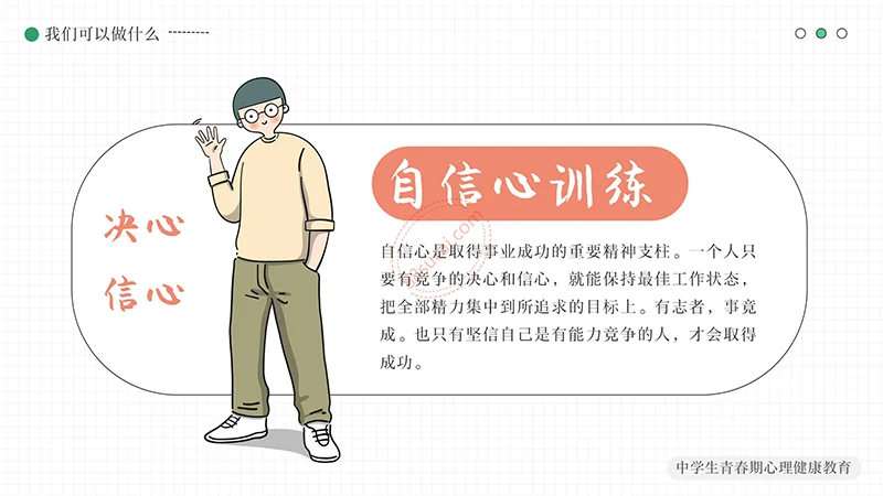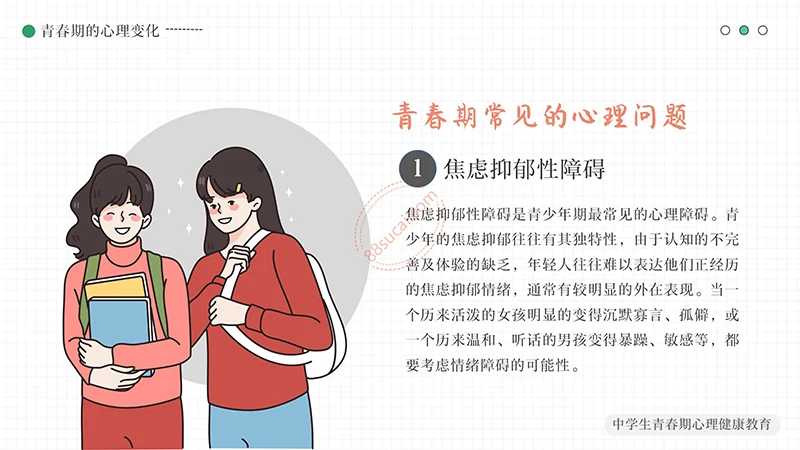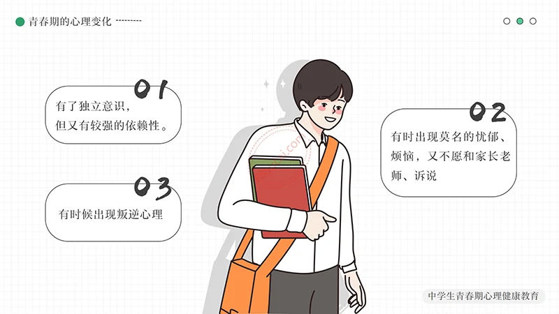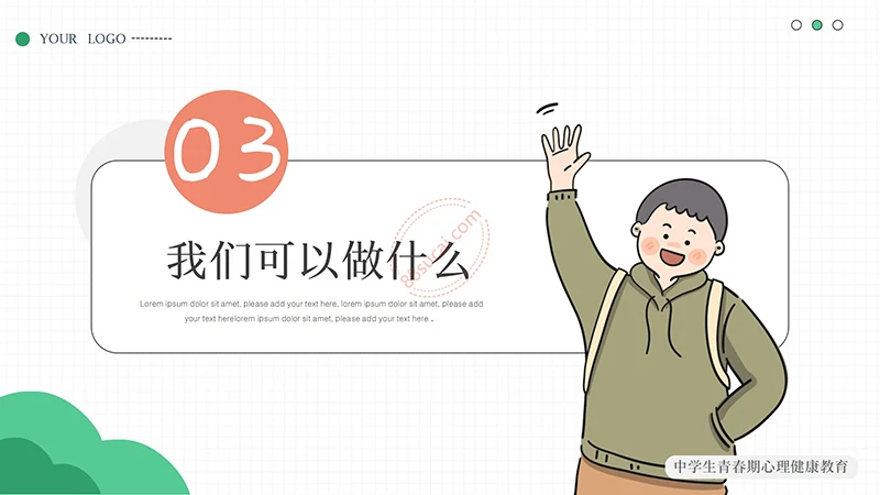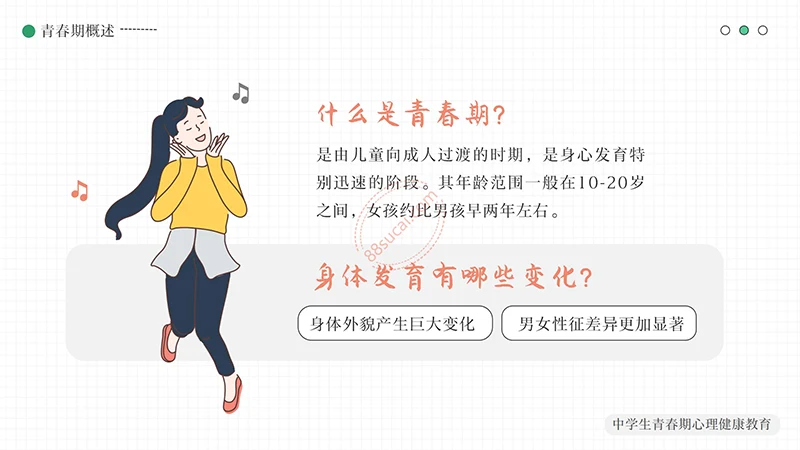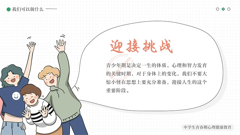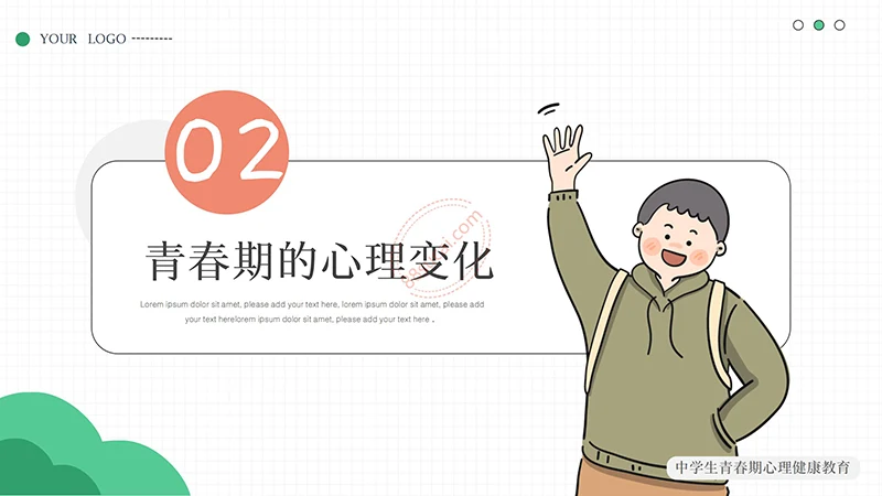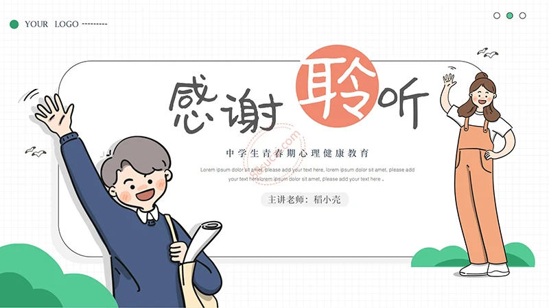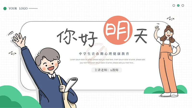 你好明天中学生青春期心理健康教育PPT模板整体以绿色做为主色调,以少男少女青年做为主要图形素材,不但颜色还是图形素材都紧密贴近中学生青春期心理健康教育的主题。