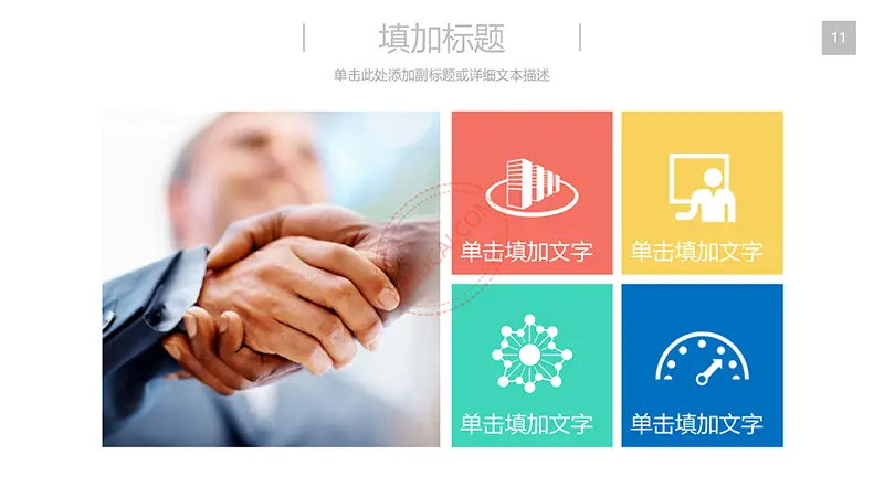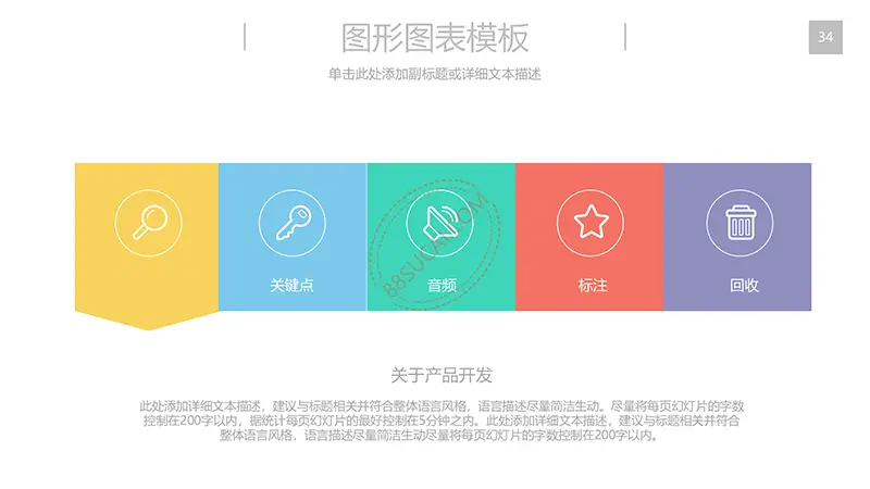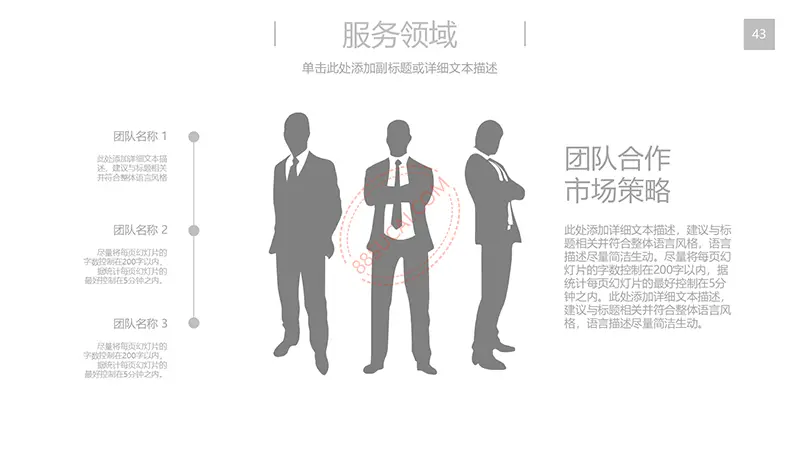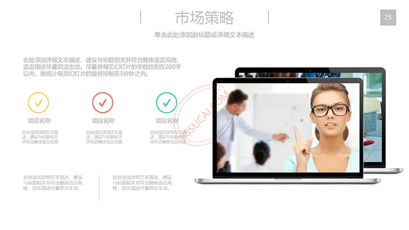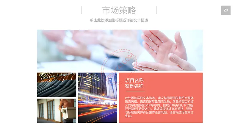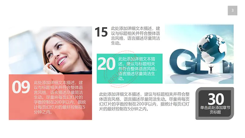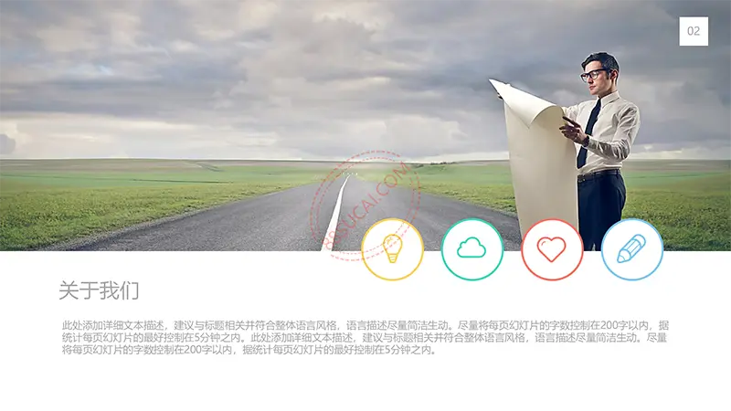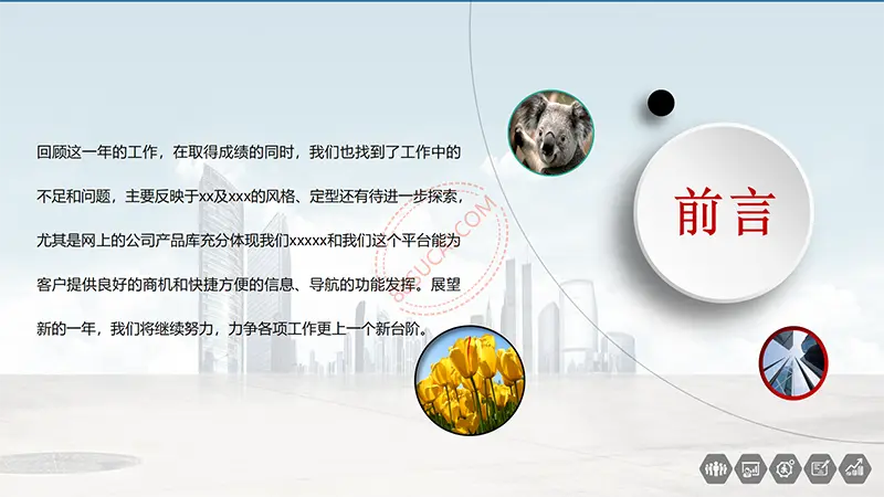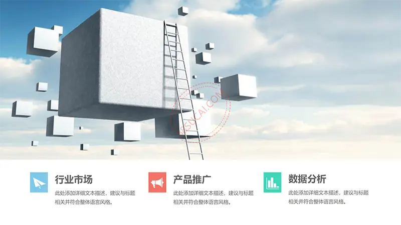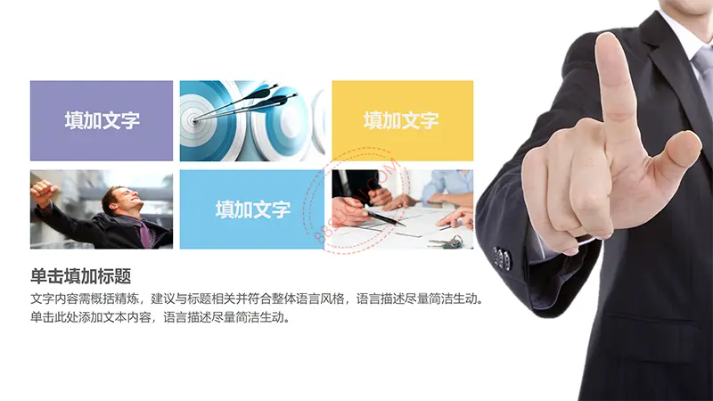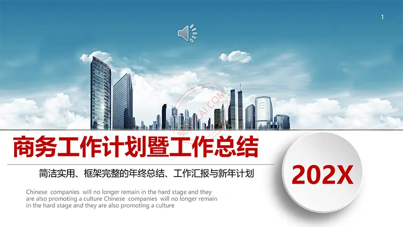 该商务工作计划总结PPT演示模板是一款内容全面,风格高端,用于商务场合的通用PPT演示模板,演示稿中带有大量的可更换图片(直接右击更换图片即可)的展示手法,模板末尾附两页常用PPT图标素材,可以直接调用、更换颜色。采用快速跳跃的动画设计,配置动感的播放音乐 。