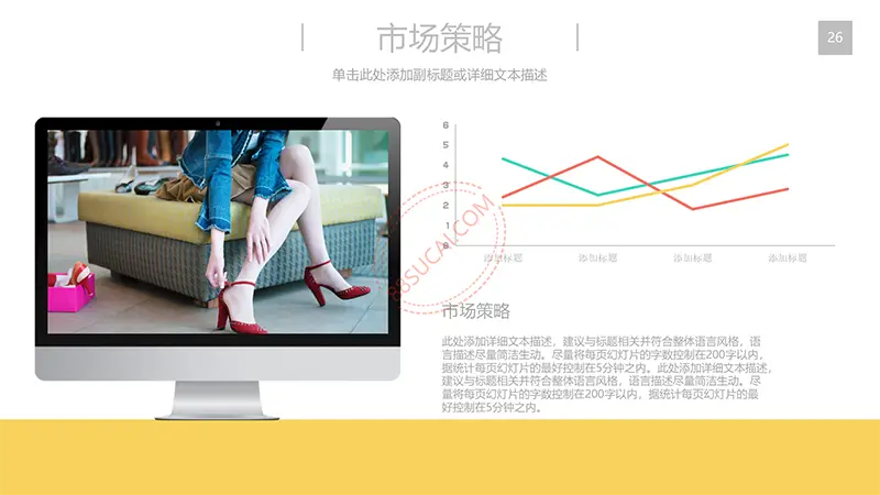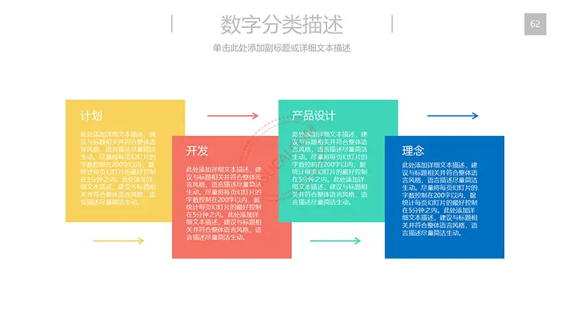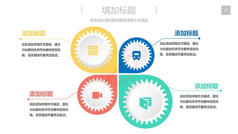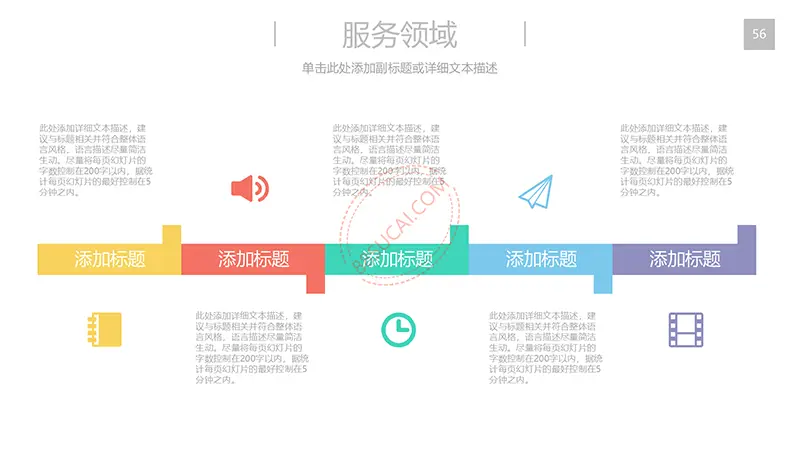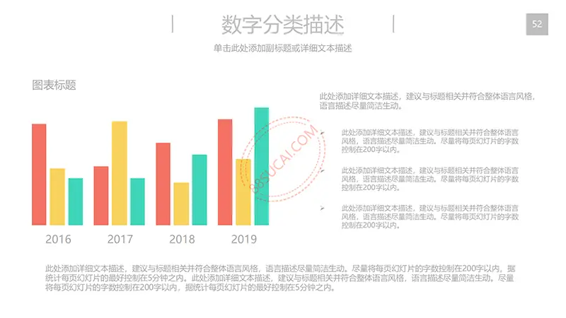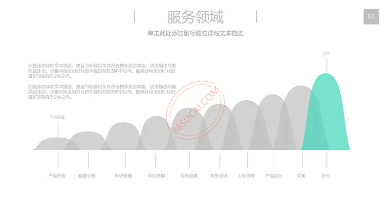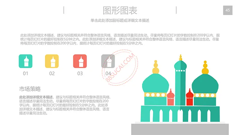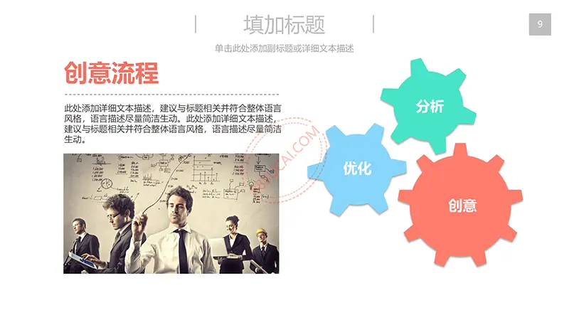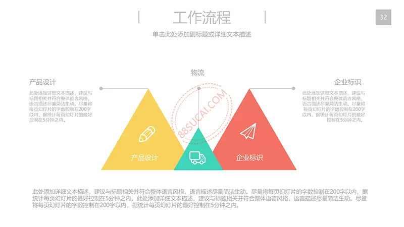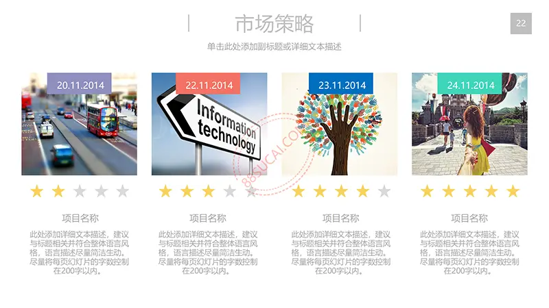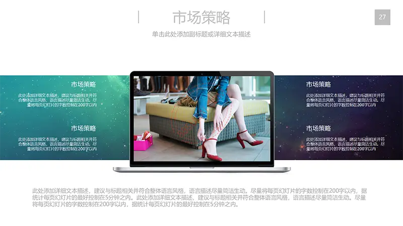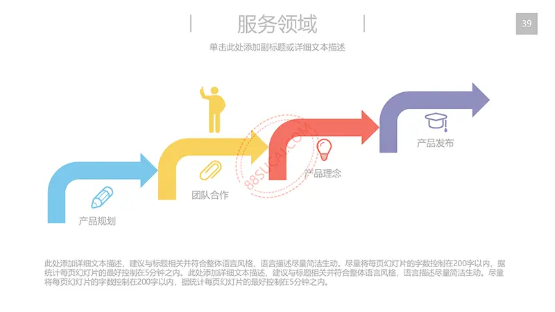该商务工作计划总结PPT演示模板是一款内容全面,风格高端,用于商务场合的通用PPT演示模板,演示稿中带有大量的可更换图片(直接右击更换图片即可)的展示手法,模板末尾附两页常用PPT图标素材,可以直接调用、更换颜色。采用快速跳跃的动画设计,配置动感的播放音乐 。