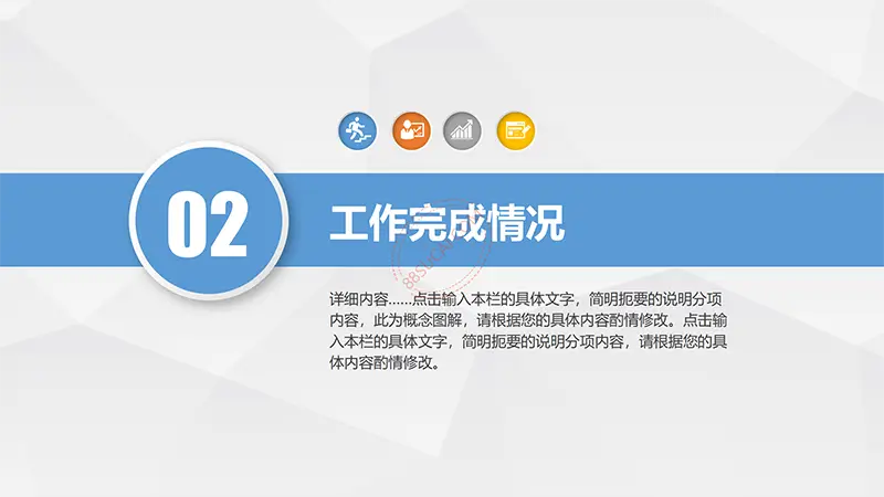 该工作计划述职报告PPT模板,采用橙、蓝色系列冷暖搭配,给人视觉上非常舒服的感觉,带白色边框的几何形状做设计元素,精致、大气。