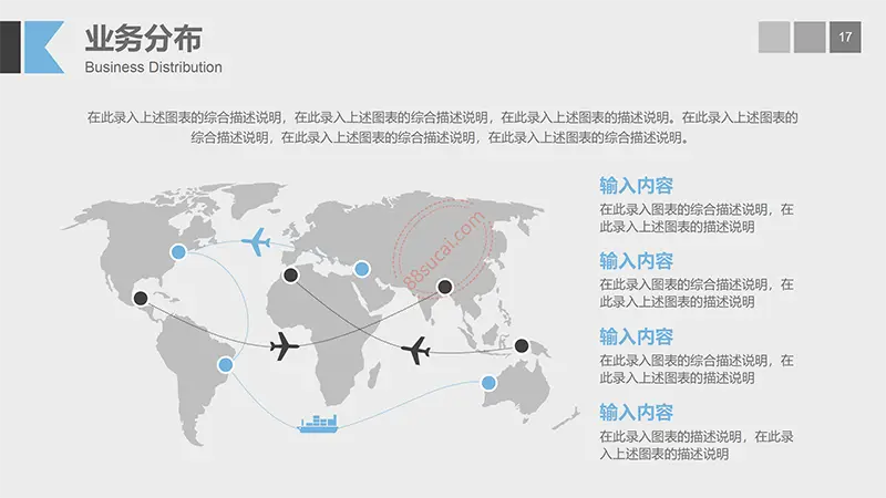该PPT模板属于电子商务总结汇报类通用PPT模板,常用于工作企业介绍PPT模板 ,计划ppt,电子商务ppt,指标汇报ppt,总结汇报ppt,科技企业ppt,主打天蓝色调,多处使用图片素材。